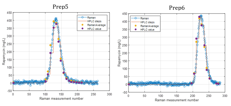To calibrate the Raman process analyzer, six different preparations were evaluated. These preparations covered a range of rapamycin concentrations, by-product profiles, and flow rates, ensuring realistic process variability.